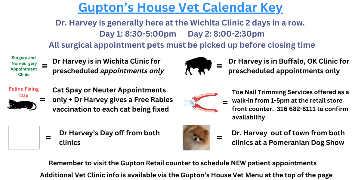 Wichita, KS 67210In 2014 Dr Suzanne Harvey, DVM established the Gupton's House Vet Clinic to feature affordable, quality vet care. The clinic has a rotating schedule, so be sure to check the clinic calendar in the vet section. We also try to be very transparent about pricing, so check out the pricing section for surgeries, vaccinations, and other procedures.