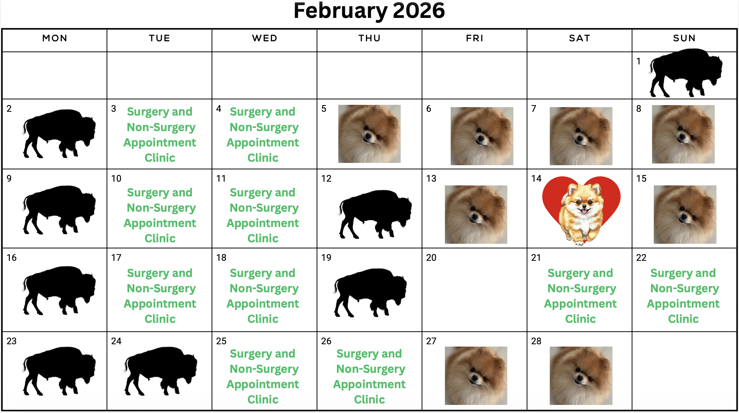 *We are a by appointment-only clinic unless a walk-in day is specified on the calendar above. Please call from 9 – 10 am on open days to check for day-of-appointment openings due to cancellations.