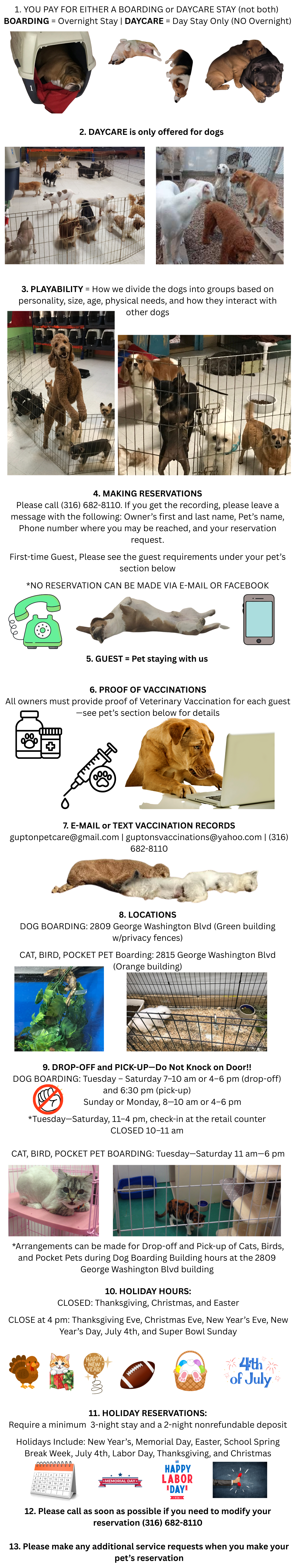 - Text (316) 682-8110 or email guptonpetcare@gmail.com updated vaccination records if the guest has seen the vet since his/her last visit.