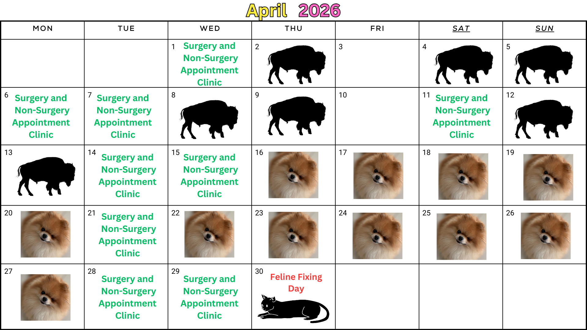 *We are a by appointment-only clinic unless a walk-in day is specified on the calendar above. Please call from 9 – 10 am on open days to check for day-of-appointment openings due to cancellations.